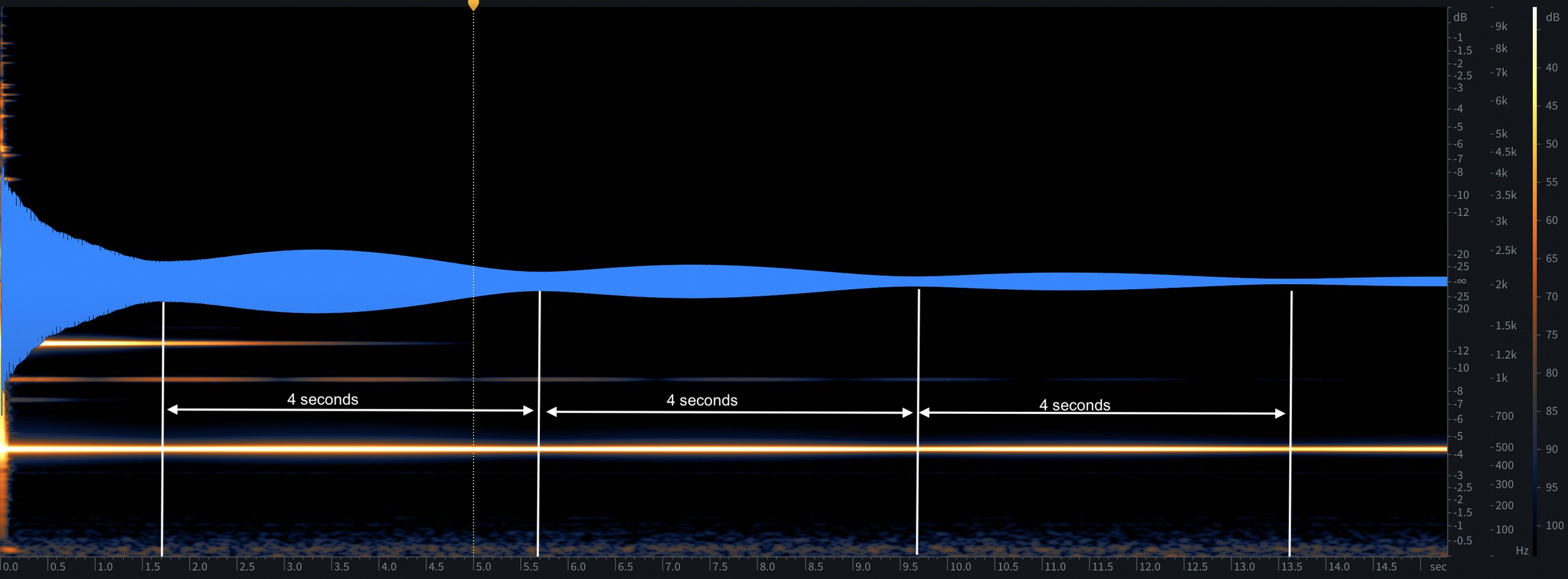 There is no attack transient on the bowed version because of the slow attack (not shown on this graph). You can see the low frequency oscillation on both the waveform view, and the sonogram view in this example. Also notice that some of the higher partials have different low frequency oscillations than the fundamental B. Some metal bowls have 3 or 4 LFO’s happening simultaneously. This graph also shows where I stop bowing and the sustain portion of the sound changes to the 4 second LFO discussed above. One might be tempted to equate the rate of the LFO with the speed of bowing, but that is not the case. The rate of the LFO is determined by the physics, material, and shape of the bowl.