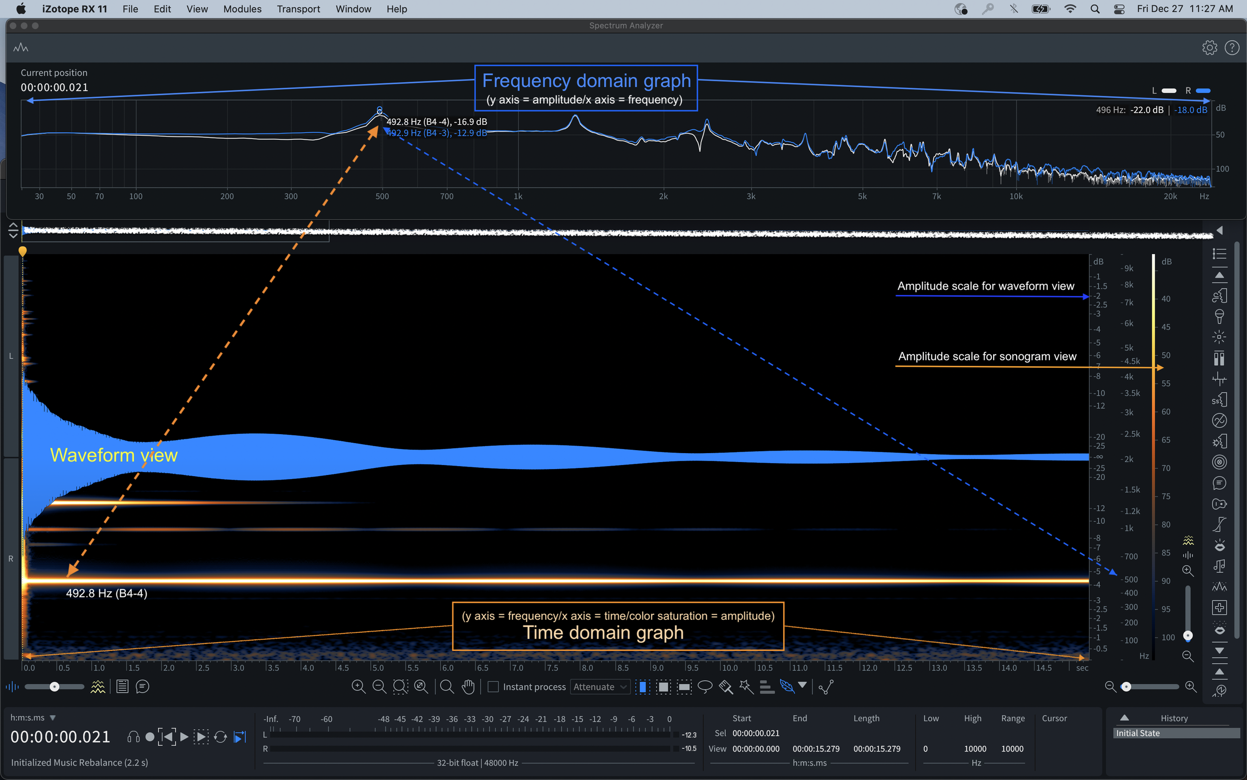First, at the top (separated by the fuzzy white line), is the “frequency domain” view. It shows the frequency components at a single point in time where the cursor is located (in this case, at the very beginning of the sound file). The y axis is amplitude (loudness) and the x axis shows the frequencies present at the cursor is location. You can see the “fundamental” tone is B4-4 with a frequency of 492.8 Hz (with very slight variation between left and right channel).